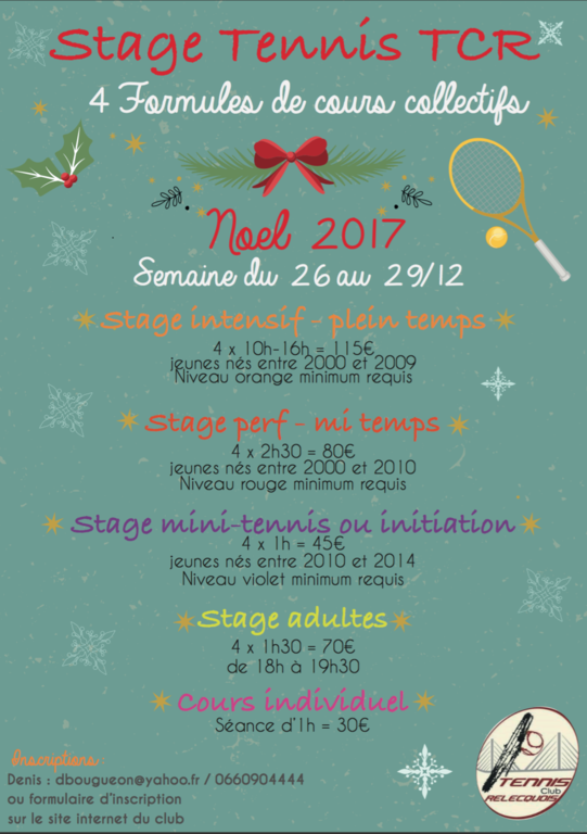 Le TCR propose des stages pour tous niveaux durant les vacances scolaires (du 26 au 29/12/2017 inclus).